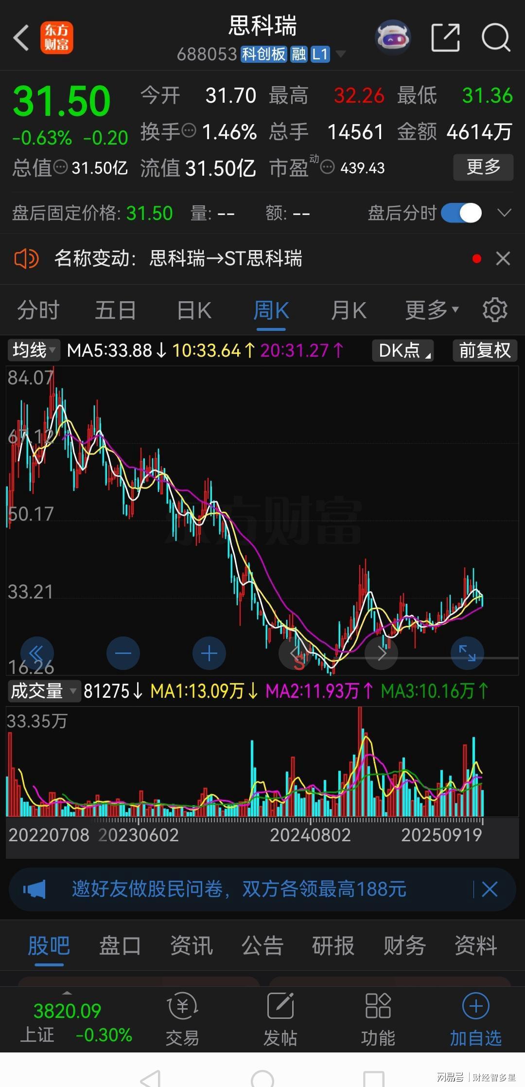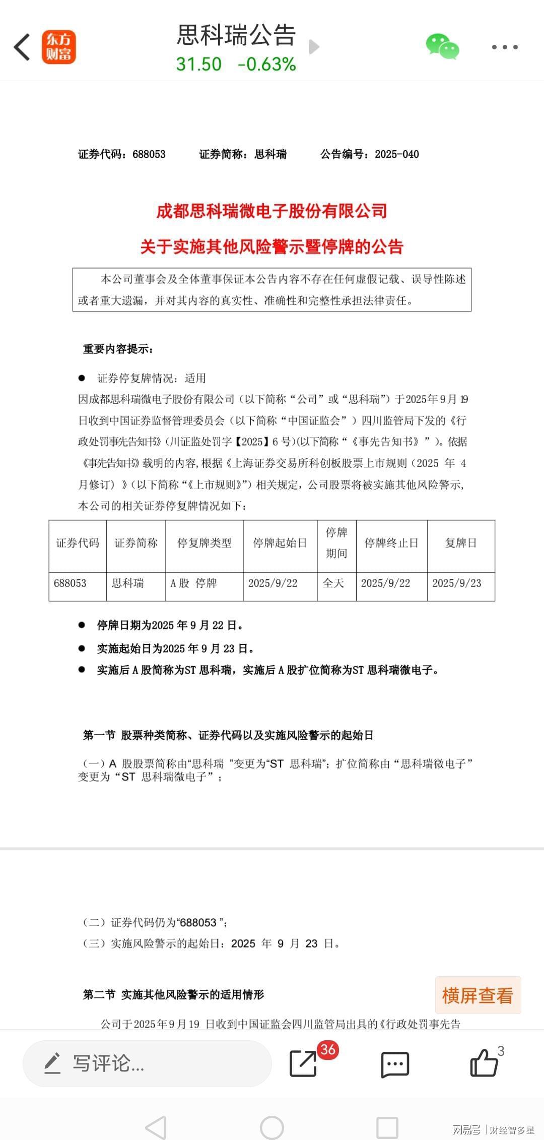 9月19日,思科瑞收到中国证监会下发的《行政处罚事先告知书》,经查明,公司2022年年度报告存在虚假记载,虚增营收996.04万元,虚增利润总额700.54万元。根据相关规定,公司股票将被实施其他风险警示,2025年9月22日停牌,9月23日股票简称变更为“ST思科瑞”。这一处罚无疑让思科瑞的股东们雪上加霜。