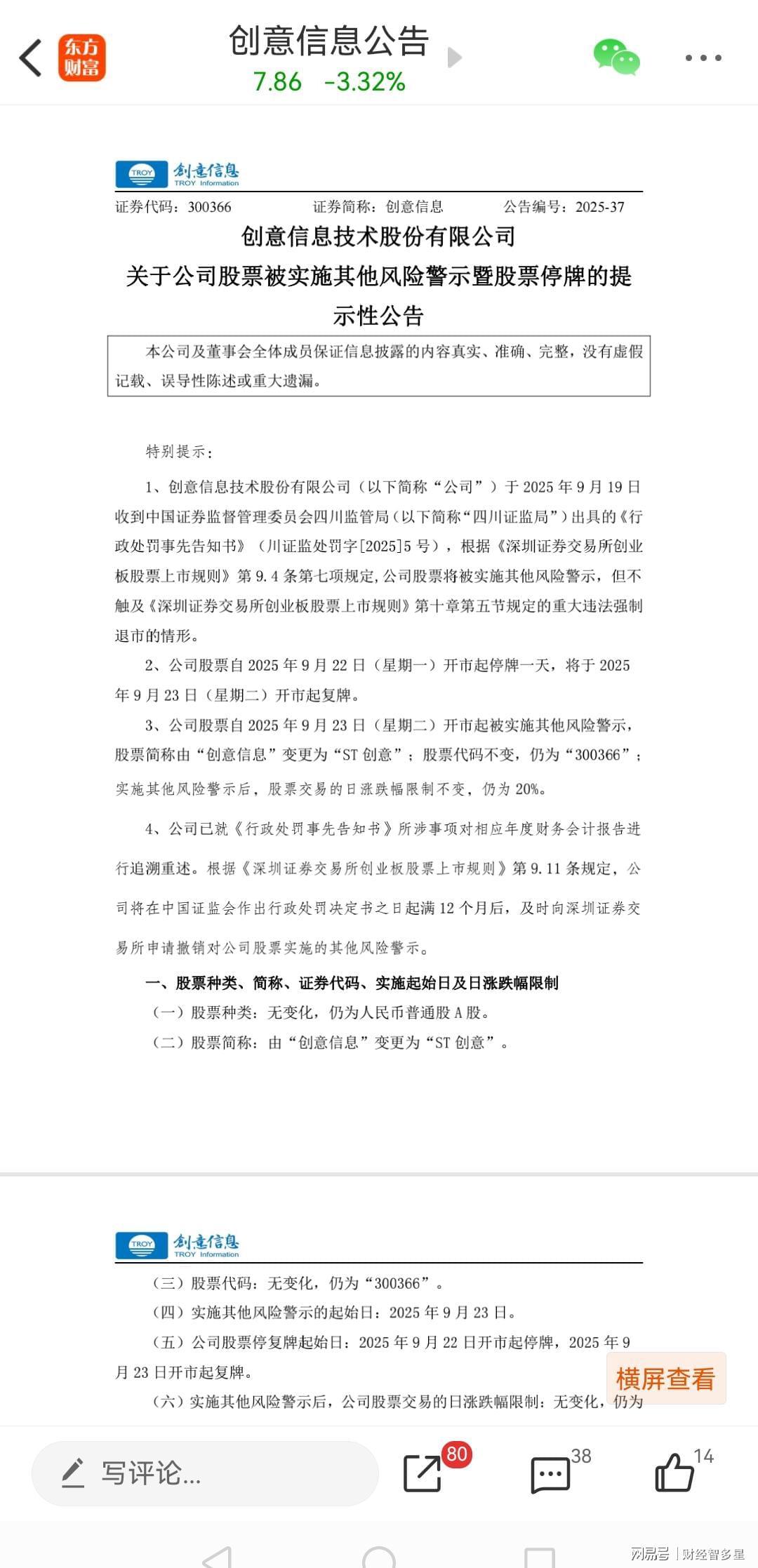 公司2022年年度报告、2023年半年度报告多计营业收入,存在虚假记载。公司股票自2025年9月22日开市起停牌一天,于9月23日开市起被实施其他风险警示,股票简称变更为“ST创意”。这一变化让创意信息的股东们陷入了深深的忧虑之中。