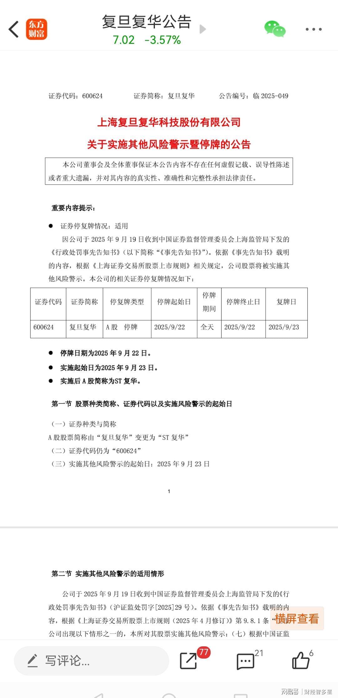 公司在2019年、2020年和2023年,三年年报存在虚假记载。其中2019年少计营业成本5056.22万元,虚增利润总额5065.22万元;2020年少计营业成本259.2万元,虚增利润总额259.2万元;2023年年度报告存在虚假记载,涉嫌少计资产减值损失2782.13万元,虚增利润总额2782.13万元。公司股票将于9月22日停牌1天,9月23日被实施其他风险警示,股票简称变更为“ST复华”。这一处罚让复旦复华的股东们倍感失望。