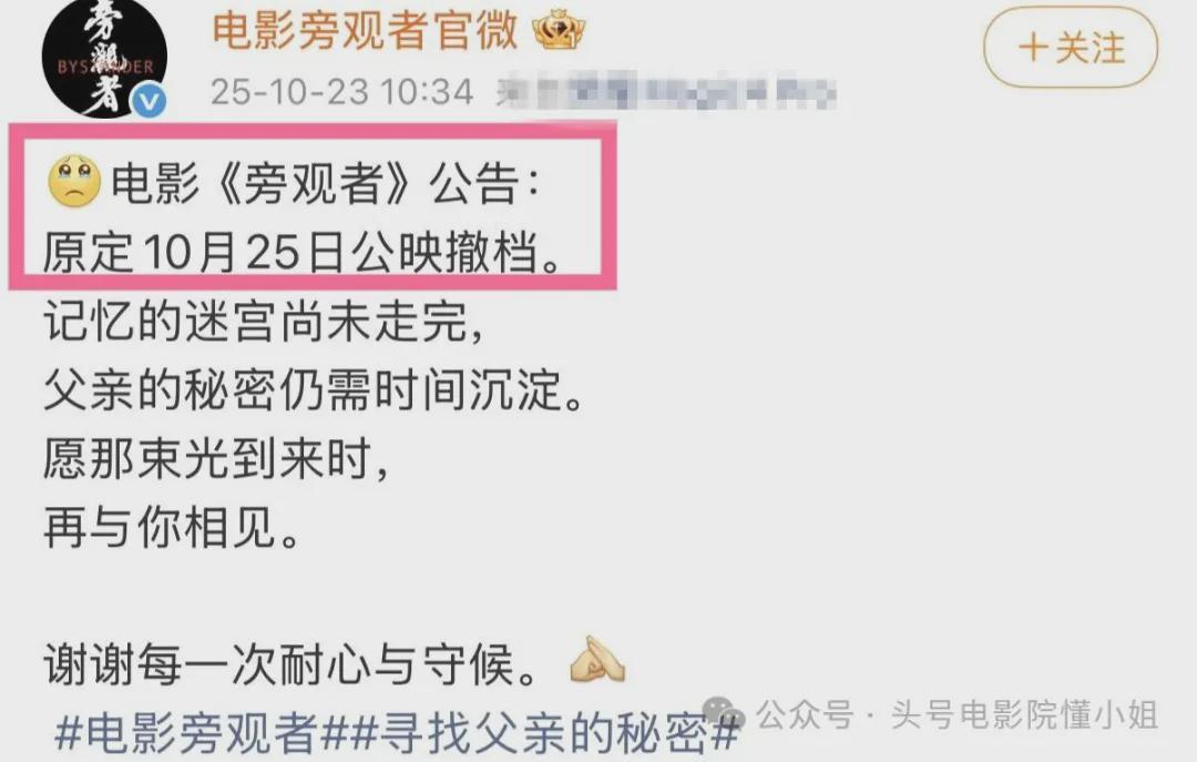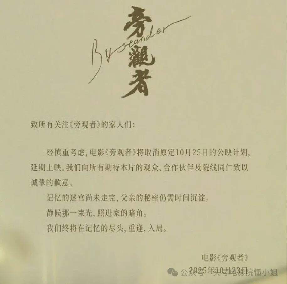 “经慎重考虑,电影《旁观者》将取消原定10月25日的公映计划延期上映。我们向所有期待本片的观众、合作伙伴及院线同仁致以诚挚的歉意。”