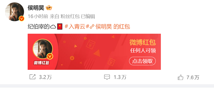 侯明昊也十分真诚,用心宣传剧竟然还在大结局时发红包,心疼粉丝做数据,以纪伯宰的名义发了红包。真的是个很真诚的演员了,难怪有那么多忠诚粉丝,这就是双向奔赴吧!