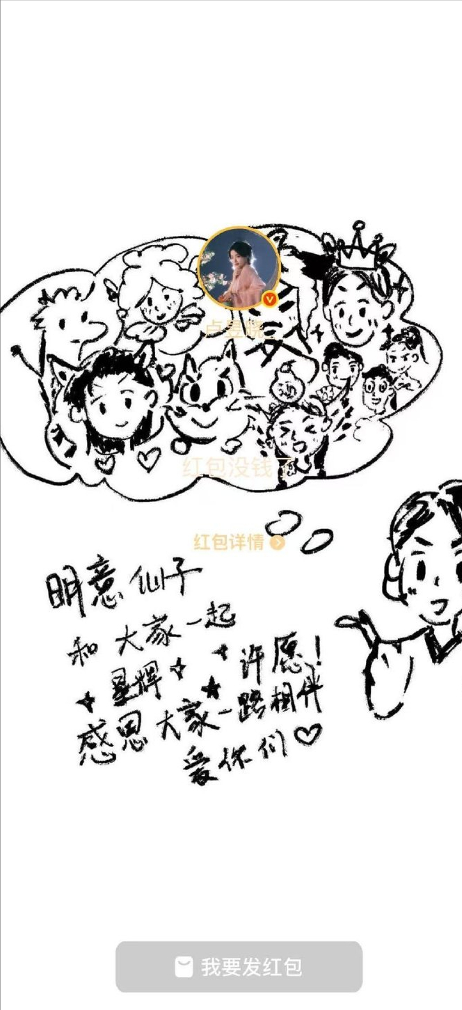卢昱晓也发了红包,而且还是亲手绘制的红包封面。卢昱晓真的太有爱了,发那么大的红包就算了,封面上还画了入青云一大家子的可爱全家福!光是看着这幅充满巧思的手绘,就已经被她的真诚和用心狠狠戳中了。真心希望平行世界里的“入青云家族”能一直这么幸福热热闹闹!