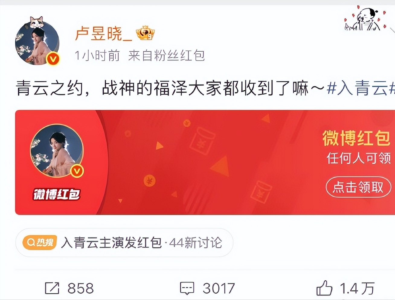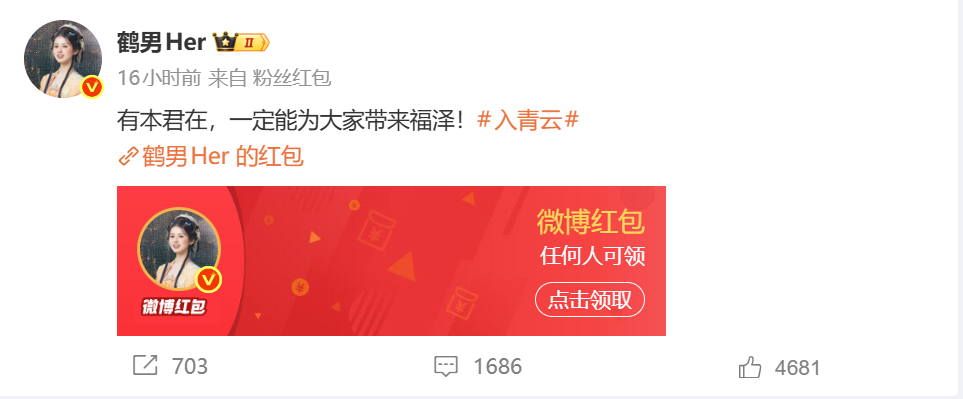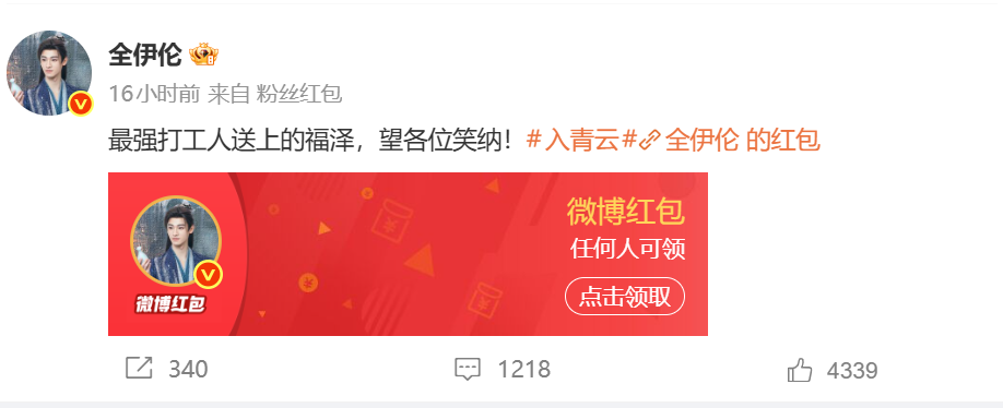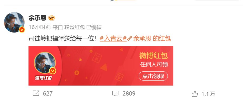 余承恩真的很爱司徒岭,把个人微博头像也换成了司徒岭,背景图也是。大结局时也发了红包,不愧是入青云,六境仙子仙君确实爱发福泽啊,真的是很不一样的追剧体验了。