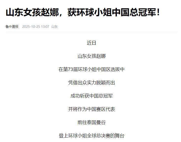 据悉,赵娜接下来将前往泰国,代表中国参加环球小姐总冠军的角逐。这一消息引发了网友们的广泛讨论。