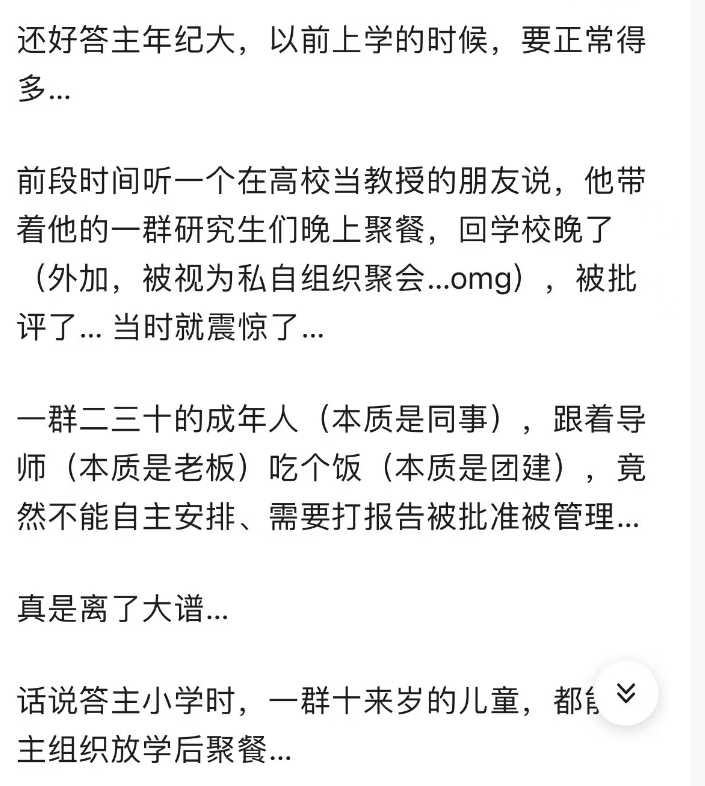 不仅如此,大学教授与学生的交往空间也受到了限制。曾经自由自在的师生聚餐,如今也变得拘谨起来。这种变化,无疑削弱了大学的人文氛围和学术自由。