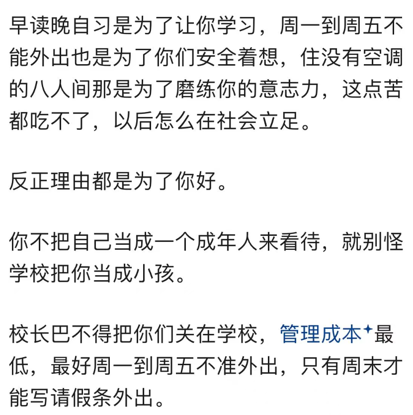 总之,国内大学普遍存在的“高中化”管理现象,已经对大学生的成长和就业产生了深远的影响。我们需要重新审视大学的管理方式,尊重大学生的独立性和自主性,让他们在自由的环境中茁壮成长。