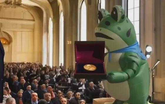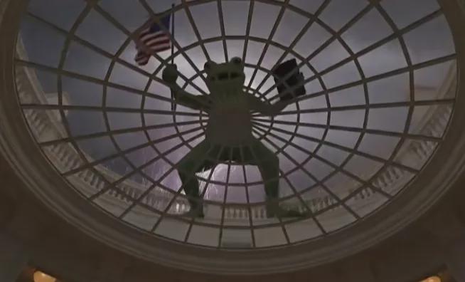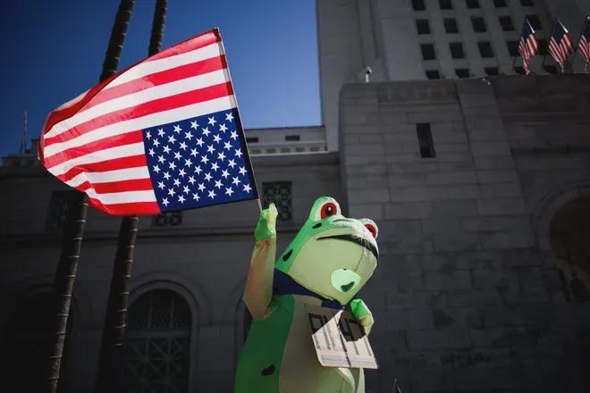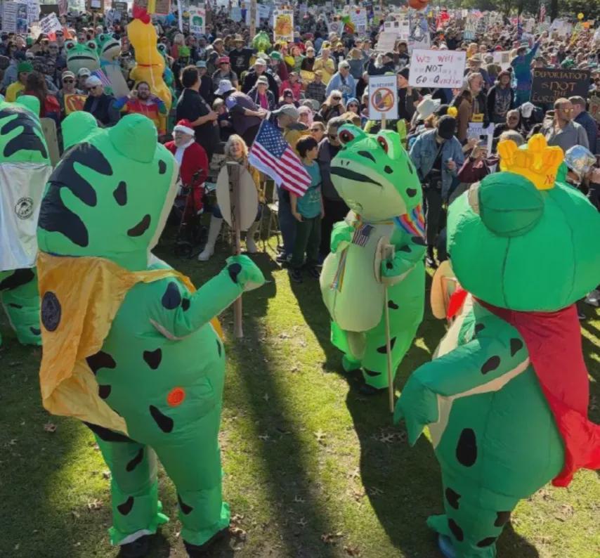 谁能想到,这群即将没入尘埃的卖崽蛙,竟然能在大洋彼岸的美国意外翻红,成为了“不要国王”抗议行动的精神象征,也成了特朗普最不想看到的东西。