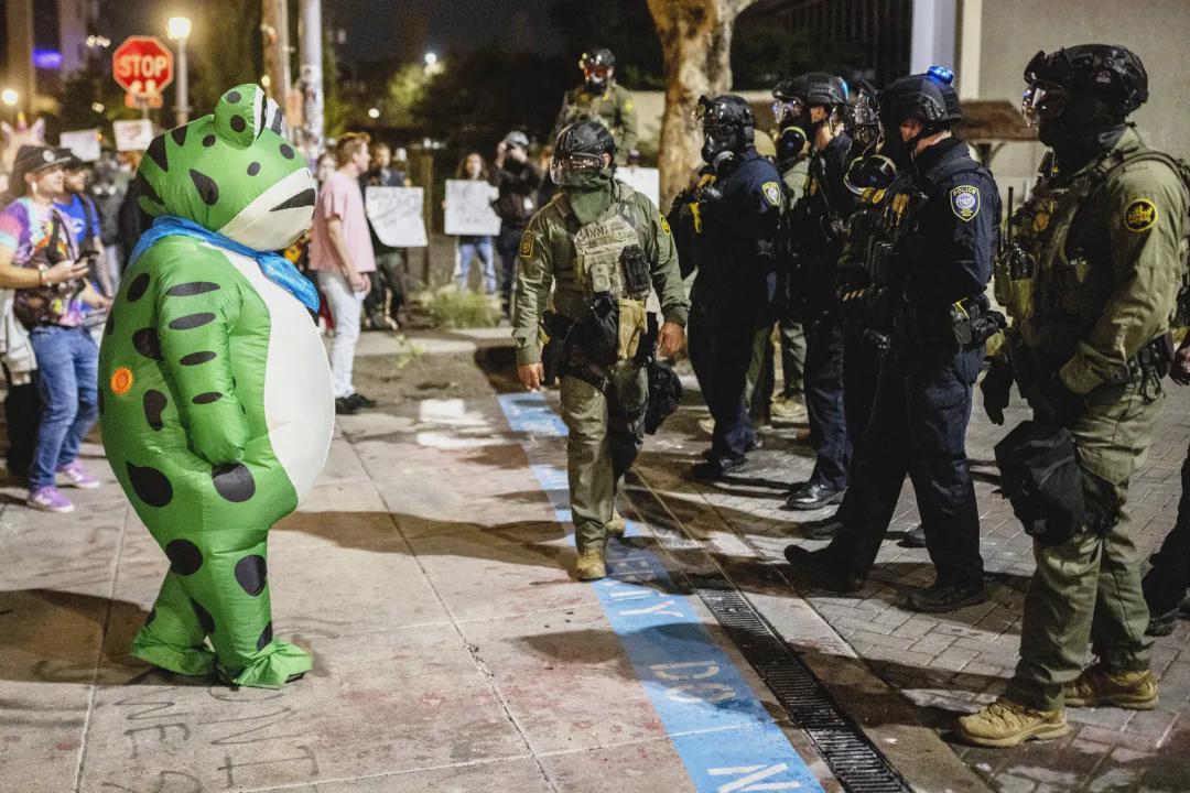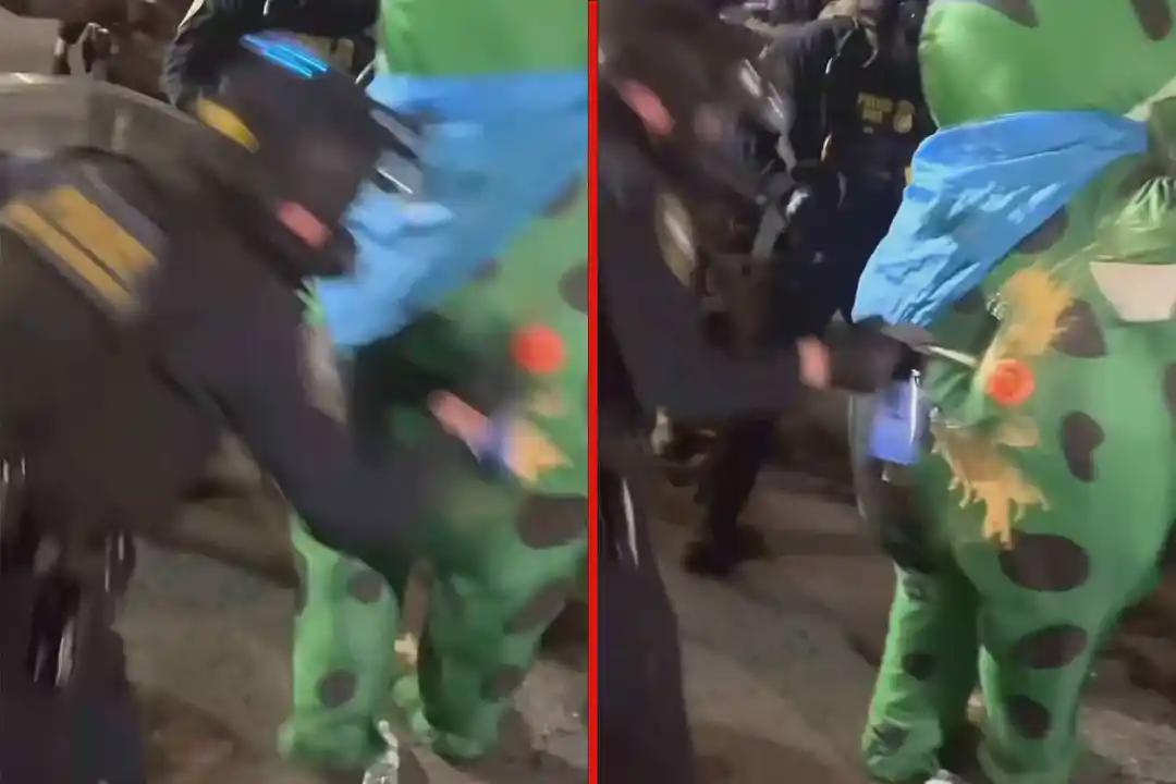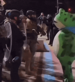 但是在10月2日夜间,出现了意外,有个叫塞思·托德的抗议者,穿着卖崽蛙充气服在移民局门口抗议,他跟全副武装的探员发生了冲突,探员不仅大力推搡了他,还故意朝人偶服的换气口,喷射了大量的催泪喷雾,可怜的托德当场就被呛到动弹不得。