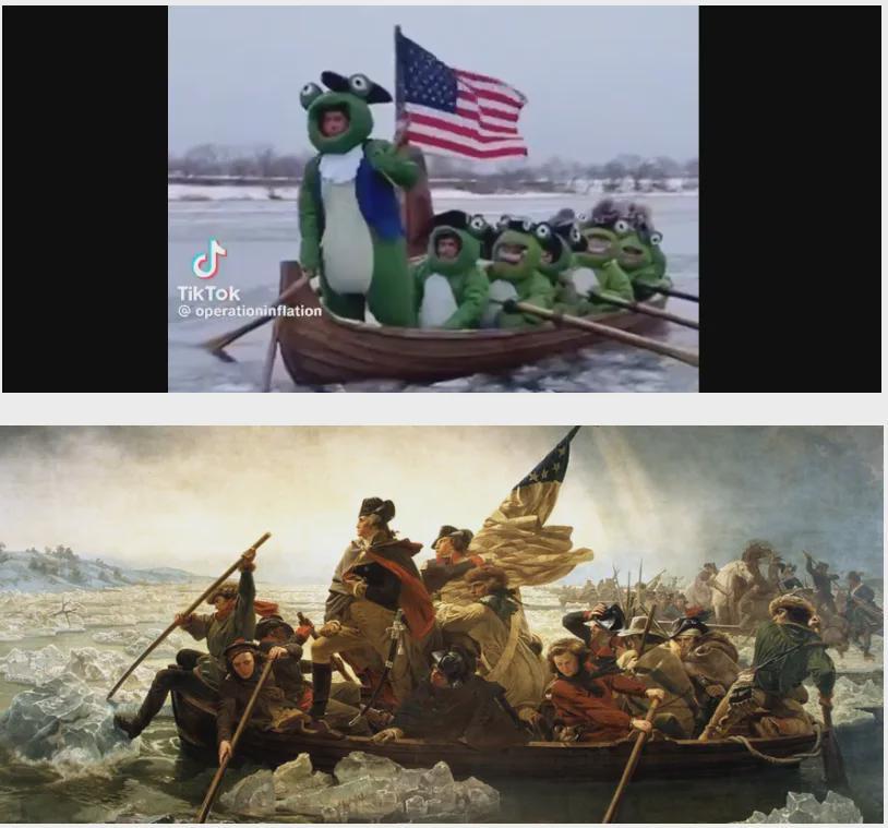 与此同时,美国历史上的各种名场面,都被抗议者拿来搞卖崽蛙二创,华盛顿渡过特拉华河,变成蛙蛙划船。