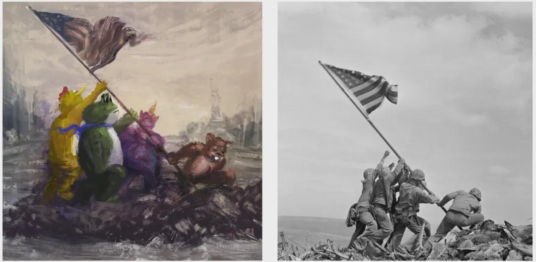 美军在硫磺岛登顶插旗,被魔改成了,卖崽蛙带着一群玩偶人插旗。