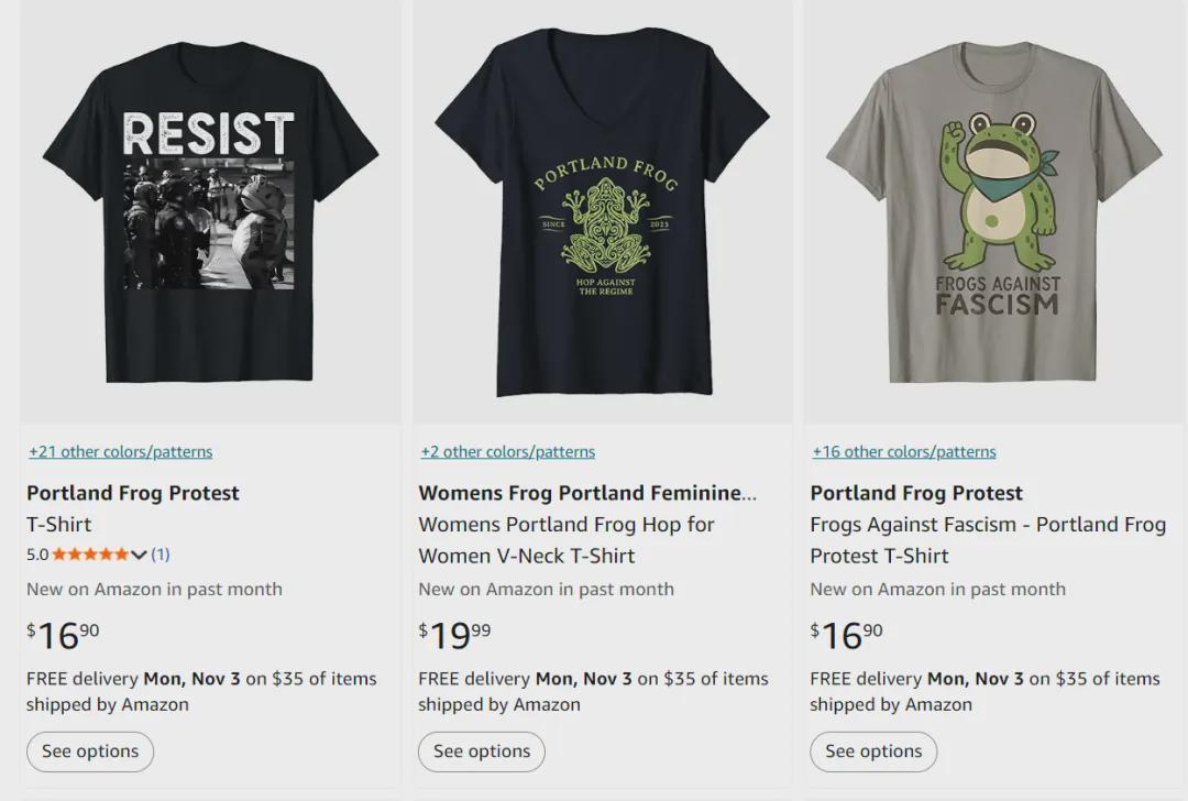 当然,正义也可以是种生意,卖崽蛙的走红,已经催生了新的商机。短短两周时间,贴纸、T恤、水杯等各种周边产品在美国各大购物平台悄然上架。