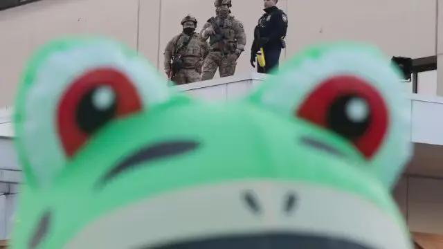 卖崽蛙们甚至跑到荷枪实弹的警察和特工面前晃悠,扭屁股,顶胯,做出各种嘲讽动作,贴脸开大了属于是。