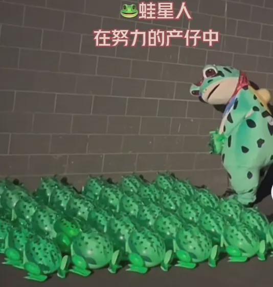 卖崽蛙这个形象,是一个中国宝妈设计的,灵感来自葫芦娃里面的蛤蟆精,它能在中国爆火,除了本身长得滑稽之外,主要是因为穿着它做生意的小商贩,在线下发生了各种趣事,拍成视频看起来很搞笑。