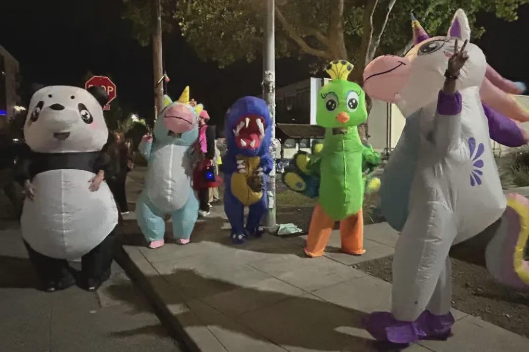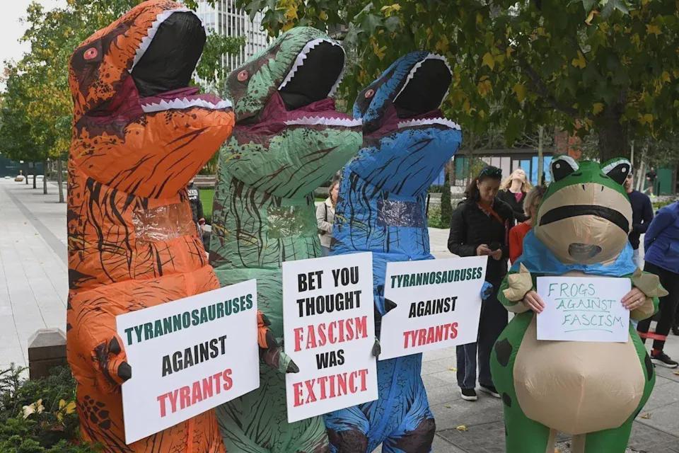 非常幽默的是,因为中国产品价格很便宜,恐龙二十几美元一件,卖崽蛙三十几刀一件,批发还能更便宜,有些富裕的组织者干脆大批量采购,然后拿到街头去免费发放,穿上就是好兄弟,进一步壮大声势。