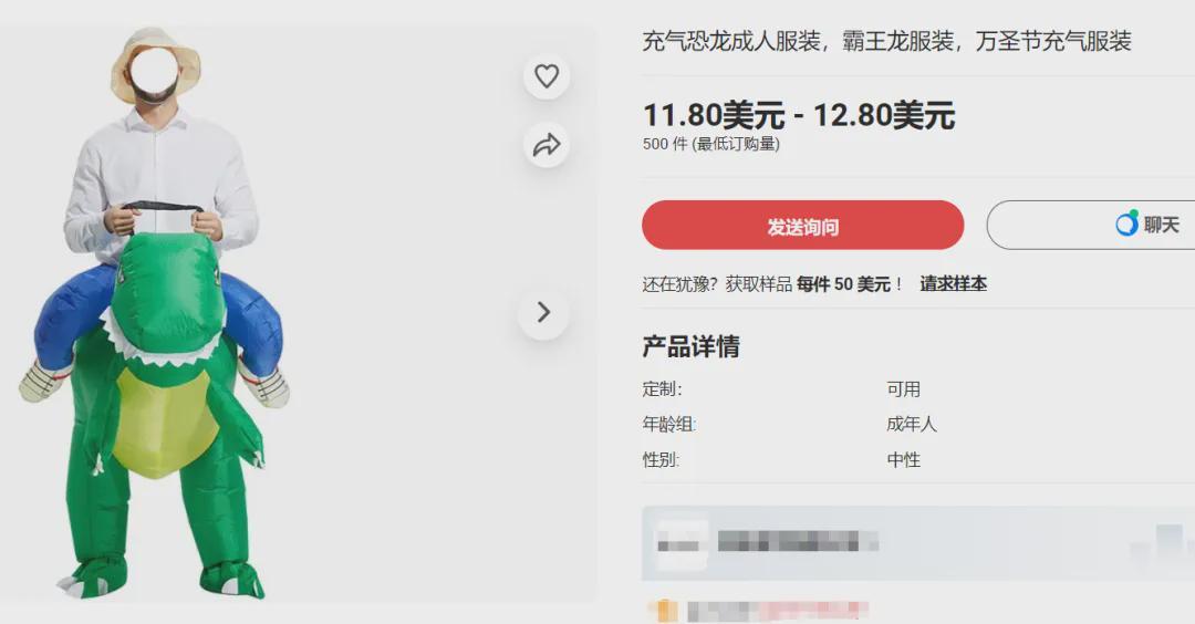 由于中国在玩具领域的优势地位,充气人偶服大部分都是在华生产的。其中有些款式,是欧美人自己喜欢的主题,什么恐龙、独角兽、海绵宝宝,当然,商家也会顺带卖一下中国流行的款式,反正都造了,内销转出口只是顺手的事情嘛,这里面就包括卖崽蛙。