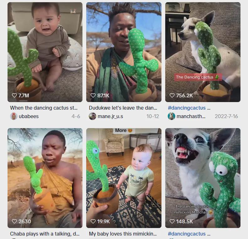 还有跳舞仙人掌,也就是一个原创设计,没有啥传统文化背景或者精彩的故事,它内置了录音播音功能,本来是给小孩学说话用的,但是因为仙人掌启动后扭扭扭的样子过于魔性,很容易吓到小孩,这反而引起了老外兴趣。TK上一群人拍摄小孩和宠物碰到仙人掌之后的反应,出了大堆的百万播放爆款。