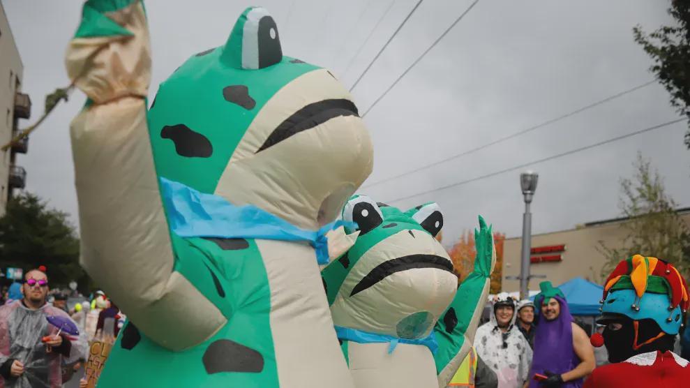 大量抗议者身穿着卖崽蛙的充气人偶服,在街头举牌子,在执法机构门前拉横幅,那些没穿人偶服的人,也戴着青蛙帽子或者绿色假发,现场看起来就像是进了什么蛙塘。