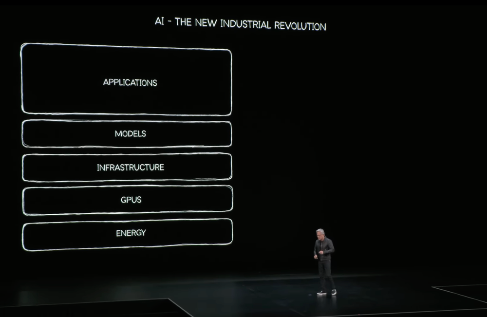 为了实现这一目标,整个计算堆栈都发生了改变。请注意,您在这里看不到Windows。这里看不到CPU。您会看到一个完全不同的、根本上完全不同的堆栈。从能源需求开始。而在这方面,我们的政府,特朗普总统,理应获得巨大的赞誉。他倡导能源,并认识到这个行业需要能源才能发展。它需要能量才能前进。我们需要能量才能赢得胜利。他认识到了这一点,并举全国之力支持能源增长,彻底改变了局面。如果这件事没有发生,我们可能会陷入糟糕的境地我要为此感谢特朗普总统。