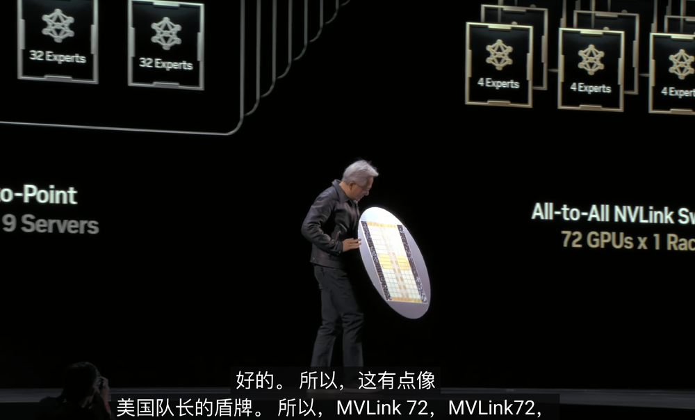 因此,这个价值数万亿美元的巨型AI 模型汇聚了众多不同领域的专家。我们将所有这些不同领域的专家都集中到一个 GPU 上。现在,这是 NVLink 72。我们可以把所有芯片都集成到一块巨型晶圆上,每位专家都能相互交流。因此,这位首席专家能够与所有在岗的专家进行交流,以及所有必要的上下文、提示和我们必须处理的大量数据,一堆tokens,我们必须发送给所有专家。专家们会…… 无论哪位专家被选中解答问题,都会随即尝试作出回应。