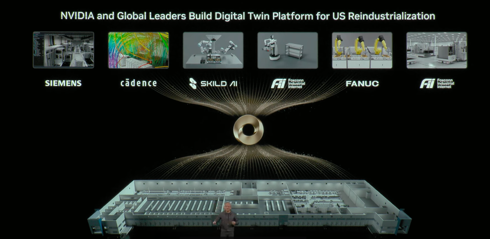 我们有令人难以置信的合作伙伴与我们一起打造工厂的物理AI。我们自己也在使用它来打造我们在德克萨斯的工厂。现在,一旦我们建成了机器人工厂,我们里面有一堆机器人,这些机器人也需要物理AI,将物理AI应用于数字孪生内部,并在其中运行。让我们看看它。