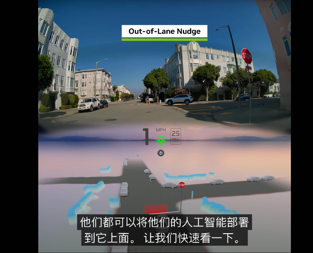 一旦你有了一个基本的标准平台,那么自动驾驶系统的开发者们,他们中有很多非常有才华的团队,例如 Wayve、 Waabi、 Aurora、 Momenta、 Nuro、 WeRide等,有这么多公司可以把他们的AV系统移植到标准底盘上运行。基本上,标准底盘现在已经变成了一个移动的计算平台。并且因为它是标准化的,且传感器套件非常全面,他们都可以将他们的AI部署到上面。我们来快速看一下。好的。
