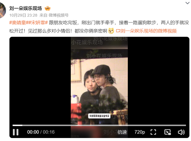 10月30日,有大V晒出“窦靖童和宋妍霏傍晚一起遛狗,然后携手回家”的视频,疑似重新定义了“什么是真爱”。