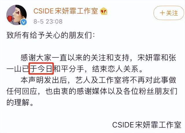 但为了彼此的体面,宋妍霏并未发声,只说是“和平分手”。
