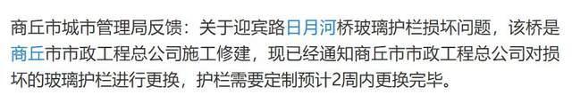 而商丘市城管局市政设施管理科则回应称,该桥尚未正式移交,目前仍由建设单位——商丘市市政工程总公司负责管理和养护。值得注意的是,早在2024年6月,就有市民反映该桥玻璃护栏损坏,当时城管局同样回复称“由商丘市市政工程总公司负责,已通知市政工程总公司进行更换。”