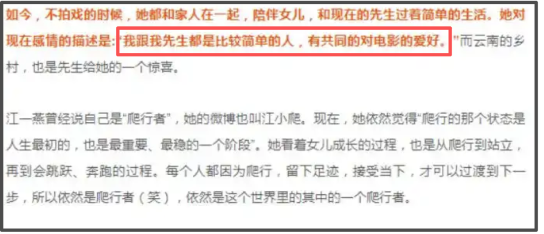 直到2022年,江一燕在接受媒体采访时,才吐露自己已经结婚,并表示和赵汉唐都是比较简单的人,有共同对电影的爱好,定居在云南的某个乡村里,生活很惬意。