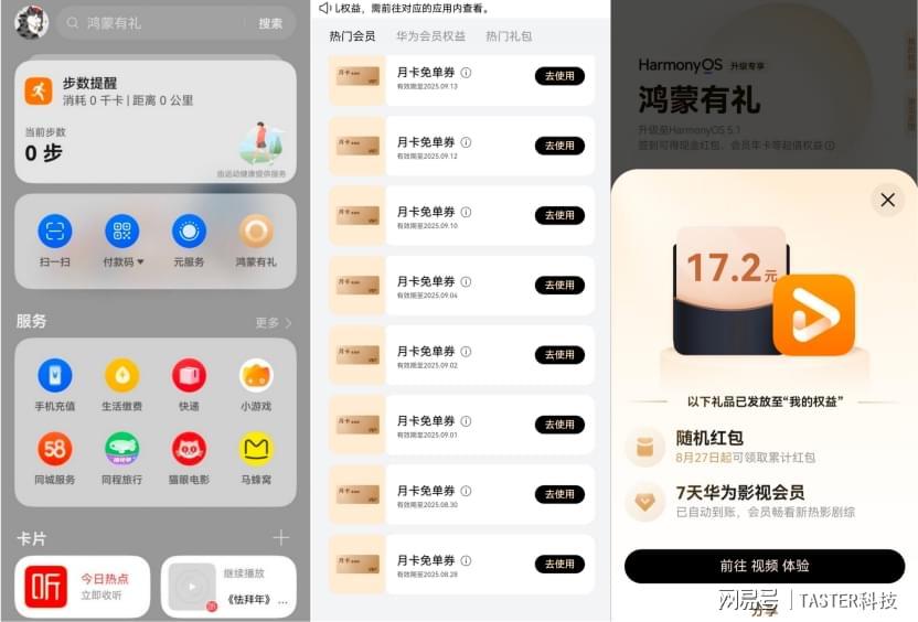 这一切还要从我上个月将手机升级到HarmonyOS 5.1说起。在桌面负一屏的“鸿蒙有礼”活动中,我意外发现了一个大惊喜——每天签到打卡,就能随机领取红包或权益。虽然每次的金额不大,但偶尔抽到的“月卡免单券”却能让我轻松兑换华为视频会员,想追的剧综直接免费看,真是太划算了!