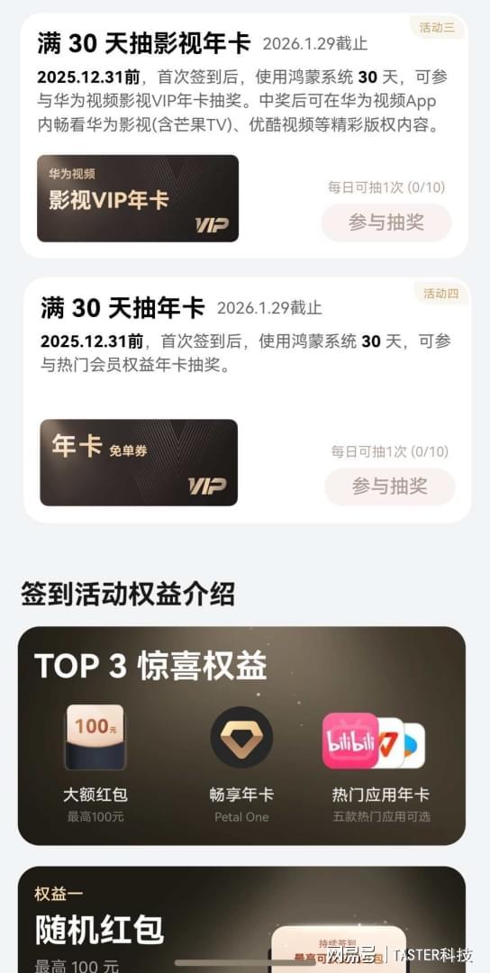 这种“薅羊毛”的乐趣让我坚持签到了30天,没想到更大的惊喜还在后面。首次签到满30天后,我便解锁了“鸿蒙有礼”的新活动——抽取影视VIP年卡!每天都有一次抽奖机会,最多可以抽10次,这样的好事怎能错过?