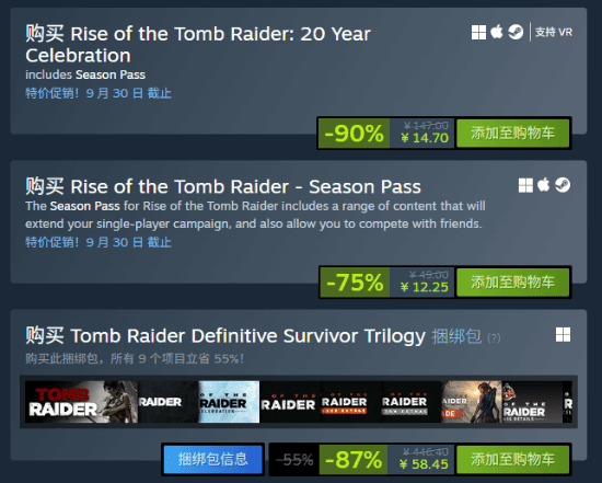 对于想完整收藏的玩家,新版《古墓丽影》三部曲合集也推出新史低优惠,仅需58.75元即可一次性获得三款高清重制版游戏(含全部DLC)。这个价格比单独购买省去近60%费用,是补票收藏的绝佳时机。