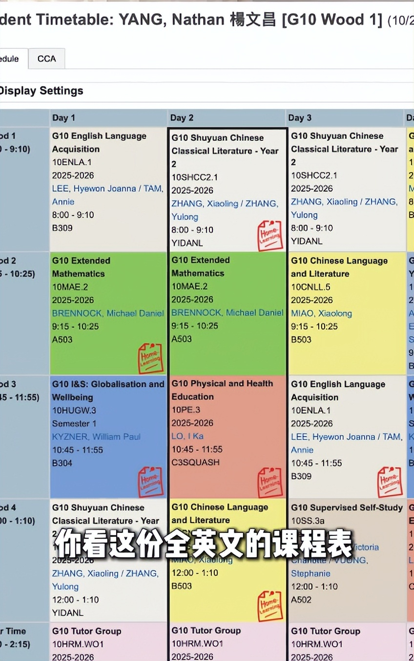 可真正的挑战,在杨阳洋入学后才开始。杨威渐渐发现,儿子所学的课程自己完全摸不着头脑 ——IGCSE、IB,这些陌生的课程名称,杨威连念顺都要费些功夫,更别说理解课程内容了。更让他焦虑的是,杨阳洋的课程表早已换成了全英文,每次想问问儿子的学习情况,看到满屏的英文单词,杨威都不知该从何开口。