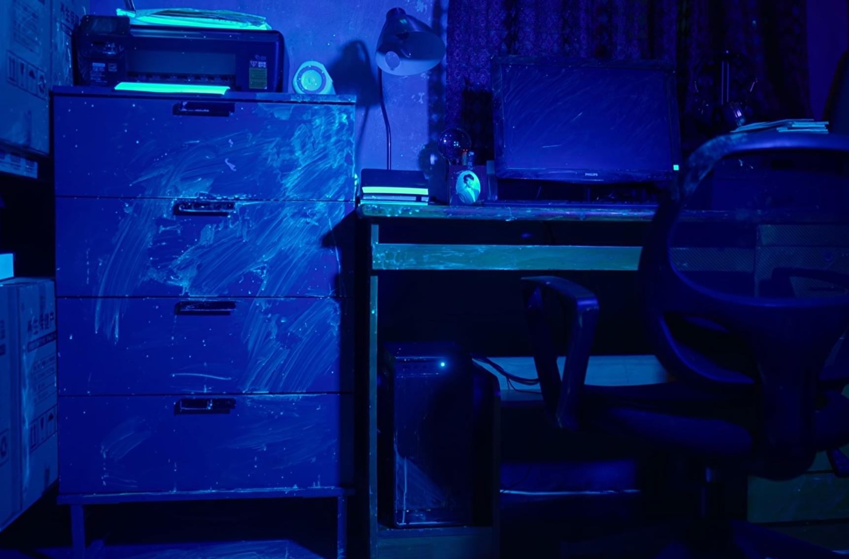 紫光灯下,满屋都是藏在视线下的血迹,拖拽、喷溅、擦除....想想都能看出刚刚经历过什么。