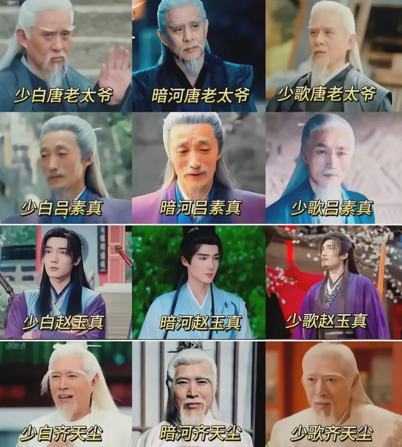 还有少歌吕素真=少白吕素真=暗河吕素真,都是由喻庆真扮演的。少歌齐天尘=少白齐天尘=暗河齐天尘,都是由沈保平扮演的。看来他们的档期确实很满。