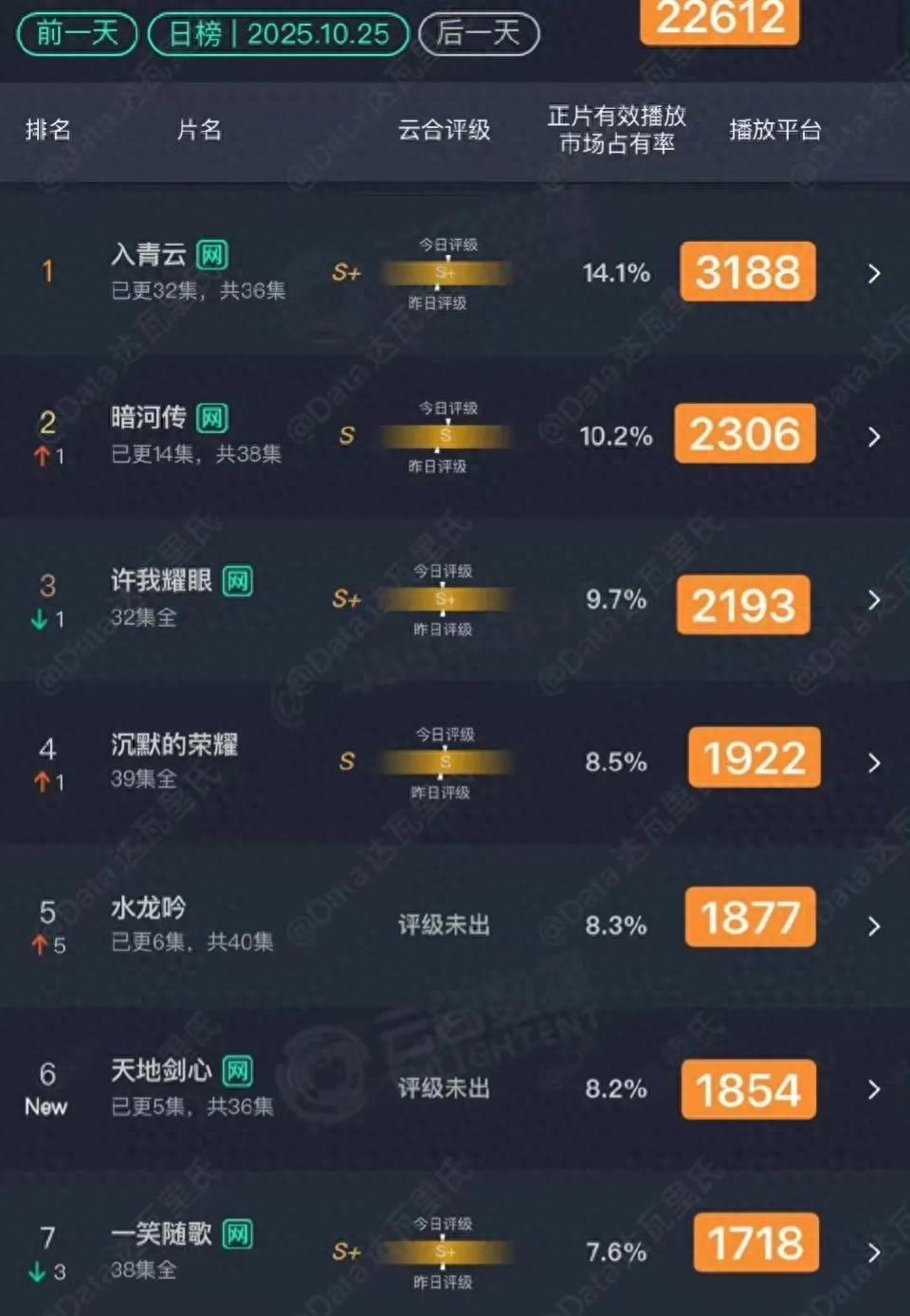 《入青云》在前期成绩表现一般,被不少人吐槽权谋线低幼,反派动机单薄。但没想到播出过半后,口碑热度还起来了。主要就是一众演员从脸到演技都没得挑,剧情丝滑节奏紧凑,人设cp都在线。难怪在播放尾声时云合市占率登顶!哪怕后期还有《暗河传》、《水龙吟》、《天地剑心》相继播出,造成了一些分流,这部剧的热度依然在稳定上升,成为同期热度最高的古装剧。