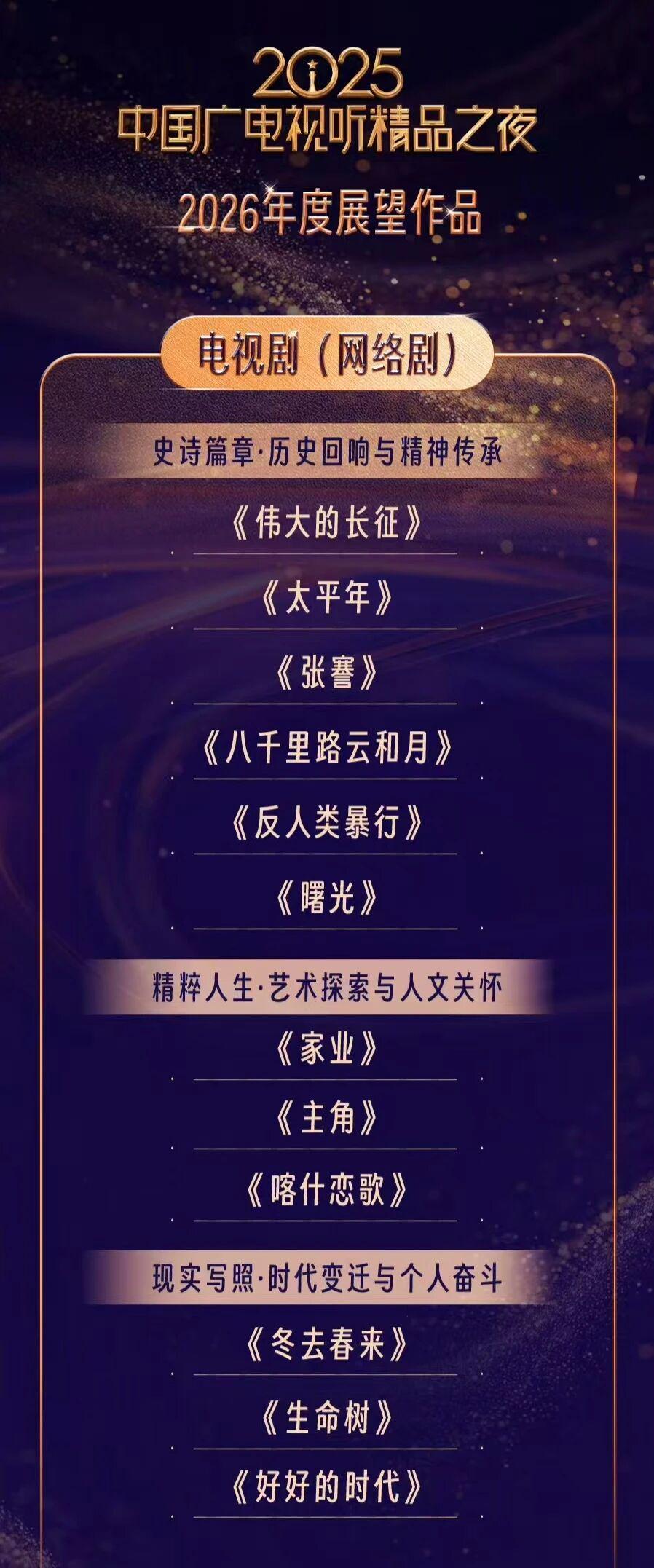 10月28日,2025广电视听精品之夜在京举行。作为2025广播电视精品创作大会的重头戏,现场发布了“2025年度推荐作品”和“2026年度展望作品”两大片单。