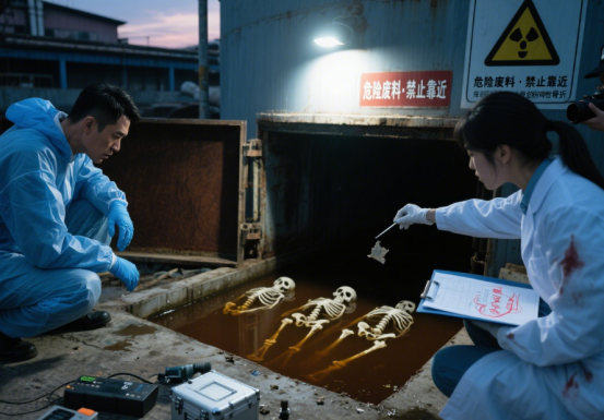 第一个察觉异常的是负责检测废料储罐的工人王师傅。当三号储罐的压力读数出现异常时,他戴上防毒面具拧开观察口,仅一眼便胃里翻腾——本该是浑浊液体的储罐底部,赫然沉着三具被强腐蚀性工业废液浸泡得惨白的骨架。几缕残余的黑色长发在粘稠液体中漂浮,如同绝望的招魂幡,骨架以扭曲的姿势交缠,仿佛在生命最后一刻仍在承受巨大痛苦。