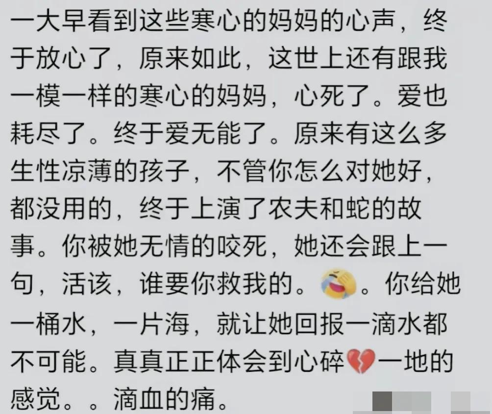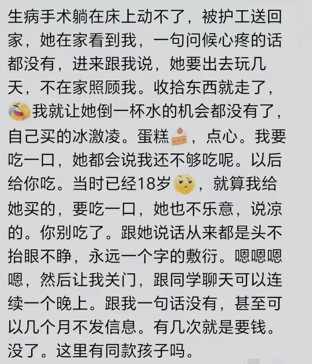 另一位父母则经历了完全不同的故事。她的女儿大学毕业后工作近两年,从未给父母买过礼物或给过一分钱。前段时间,她让女儿帮忙寄个东西,女儿竟因十块钱邮费对她破口大骂十几分钟。这位父母心灰意冷,最终拉黑了女儿的所有联系方式。她感叹:“养娃这么多年,没想到会是这样的结局。”
