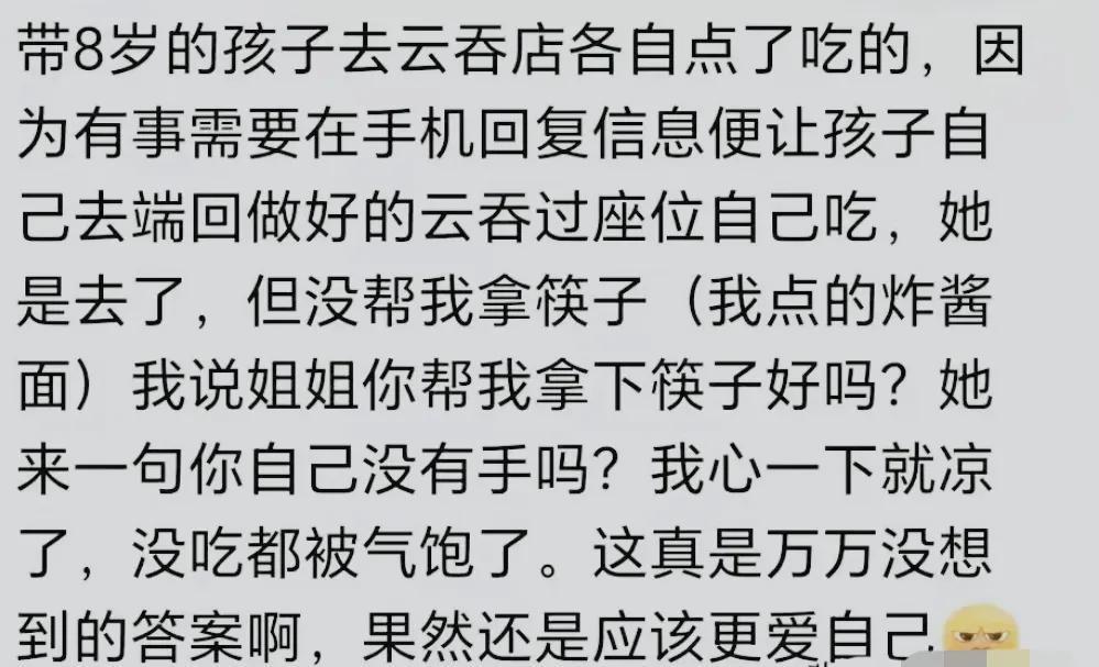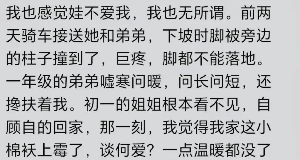 并非所有孩子都让父母失望。一位网友回忆,自己从小就懂得体谅父母。学前班时,同学给她一瓣橘子,她舍不得吃,一直放在口袋里,放学后拿给妈妈吃,还谎称“同学给了我两瓣,我吃了一瓣”。她感慨:“那时候我才4岁左右,也不知道为什么会有这种意识,可能就是从心底里明白父母的不容易。”
