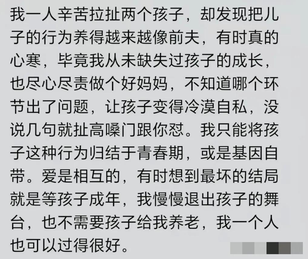 还有一位父母庆幸自己遇到了“报恩型”孩子。她20岁的儿子放假在家时,每天下班都会做好饭等她,看到脏衣服也会主动洗。偶尔她不舒服,儿子连饭和碗都不用她洗。她感慨:“感谢上苍,让我们遇见这么贴心的孩子。”