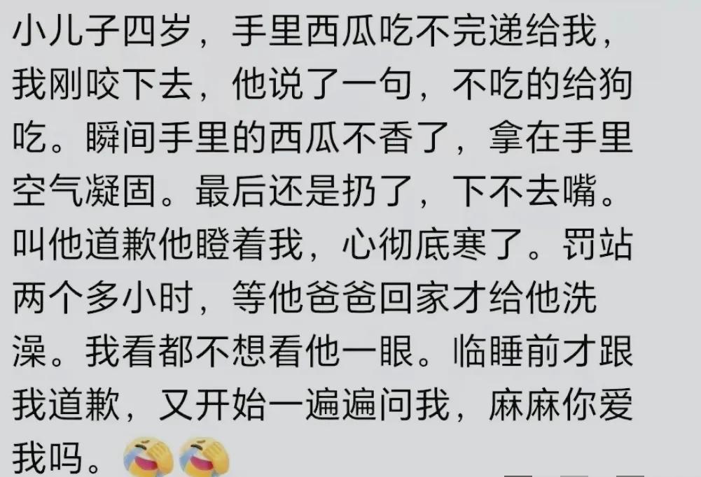 另一位妈妈则记录了儿子从半岁到高考后的成长点滴。半岁时,儿子给她刷牙时不小心咬到手指,她故意哭,儿子就一直给她吹吹;三岁多上幼儿园时,她下班晚了去接他,儿子看到她就哭了,原来她骑车摔了一跤,儿子坚持要下来给她吹膝盖;高考结束后,她发烧了,儿子让她去休息,问她想吃什么,她随口说想吃馄饨,儿子就下去买了。她吃完后,儿子说出去找朋友玩,让她睡觉,结果不到10点就回来了,第一件事就是过来看她好点没有,摸摸她的额头说:“好些了,不发烧了。”她感慨:“我爱他,他也爱着我。孩子真的是从小就看得出来爱不爱你的!”