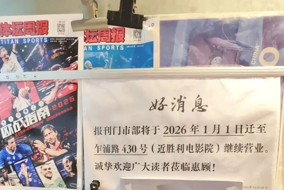 红色的牌子是怀旧感情版,上面写着:“岁月不改初心,昨日纸香再相逢。好消息!陪伴大家多年的报刊门市部,自2026年1月1日起,将迁至乍浦路430号新址(近胜利电影院)继续营业。我们依旧守候在书报的世界里,欢迎广大读者前来相聚。”