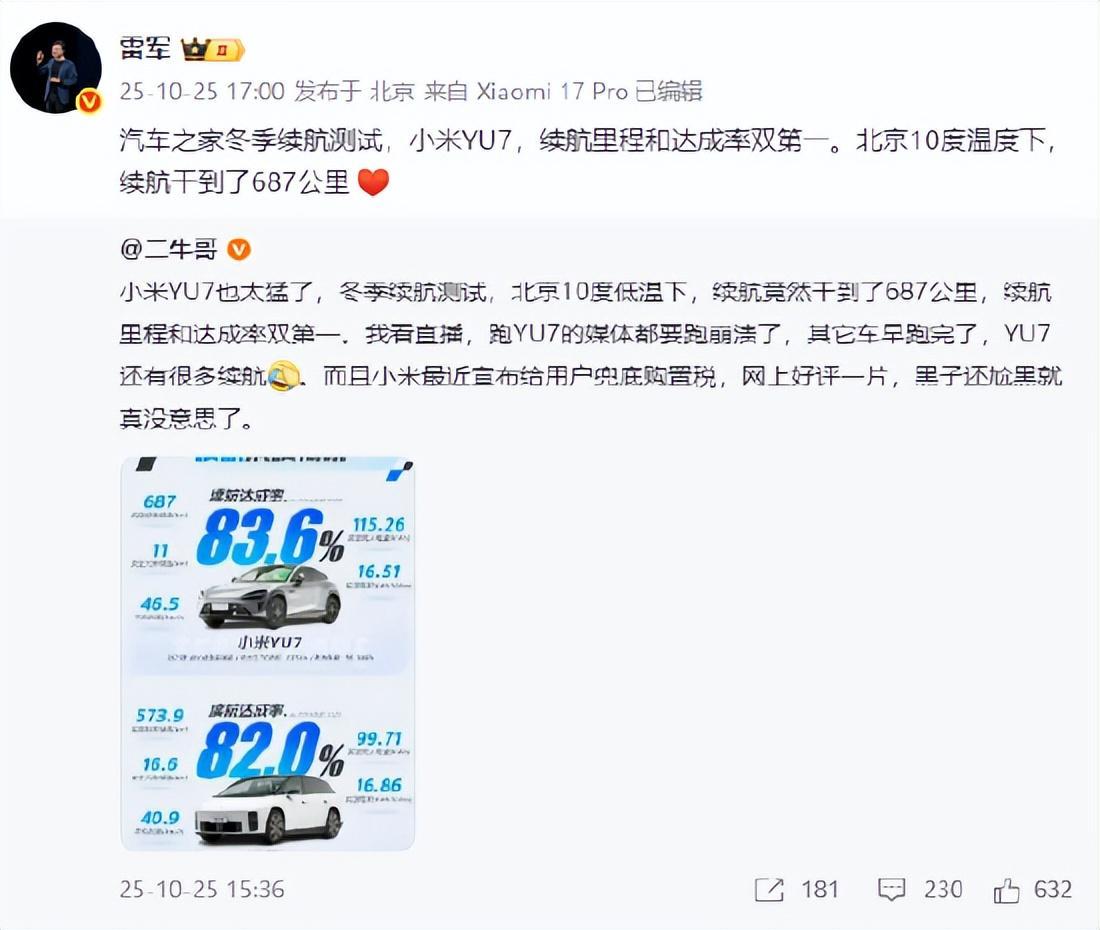 小米创办人、董事长兼CEO雷军也转发了该冬测续航数据,并自豪地表示:“汽车之家冬季续航测试中,小米YU7续航里程和达成率双双夺得第一。在北京10度的温度下,续航竟然干到了687公里。”
