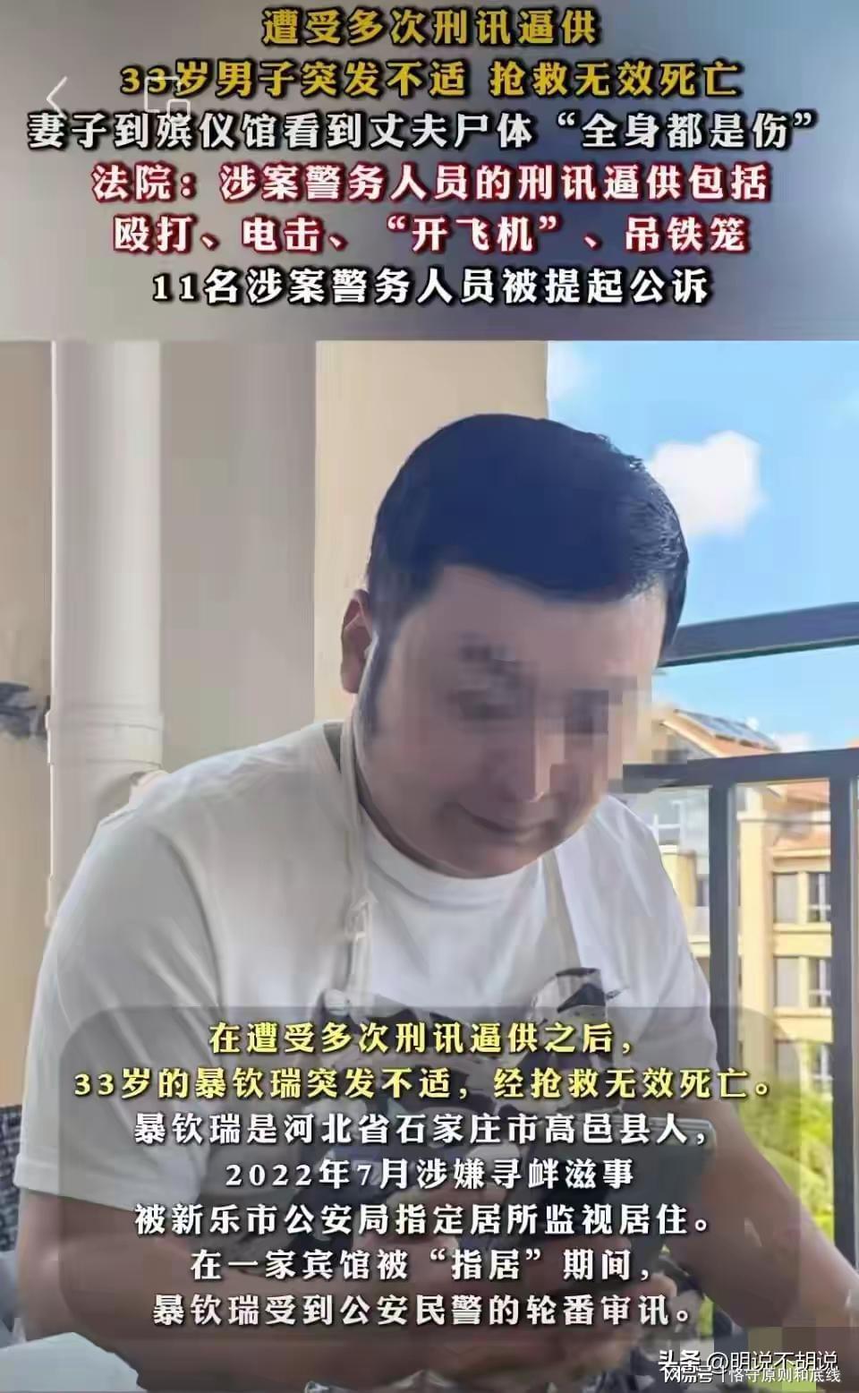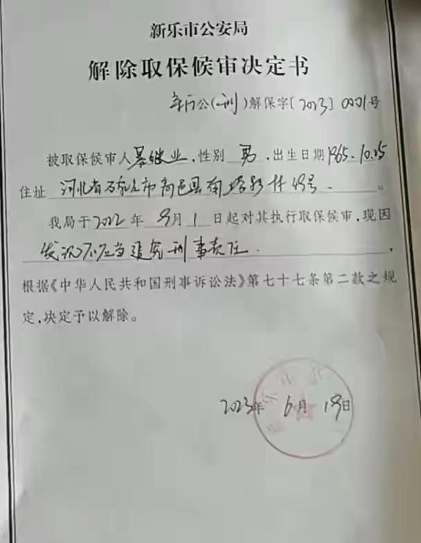 后续情况:暴钦瑞死后第三天,他的父亲暴继业还在“指居”接受“待遇”。直到暴钦瑞死后一个月多月,也就是2022年的9月份,暴继业和其他人员被新乐市公安局取保候审,到2023年6月份被解除取保候审。解除取保候审的理由是“发现不应当追究刑事责任”。