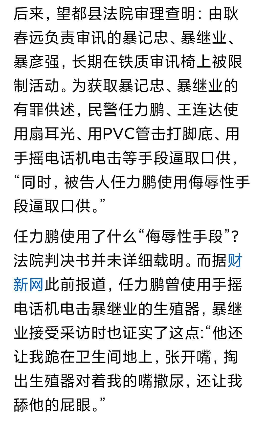 侮辱性手段:此外,还使用了侮辱性手段逼取口供。暴钦瑞的父亲暴继业称,警察任力鹏让他跪在卫生间地上,张开嘴,并掏出那个“鸟”,对着他的嘴巴直接撒尿,还让他舔他的屁眼,甚至用手摇电话机电击暴继业的命根子。