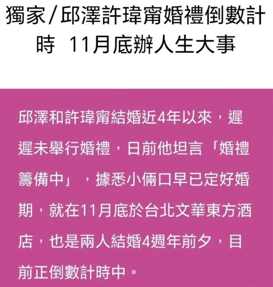 30日,台媒爆料邱澤、许玮甯将在11月底补办婚礼,目前喜帖尚未发出,但已口头向至亲好友发出邀请。对此,许玮甯经纪人回应:“静候佳音。”据悉,两人2021年结婚,今年8月得子,邱泽近期受访时透露婚礼筹备中。