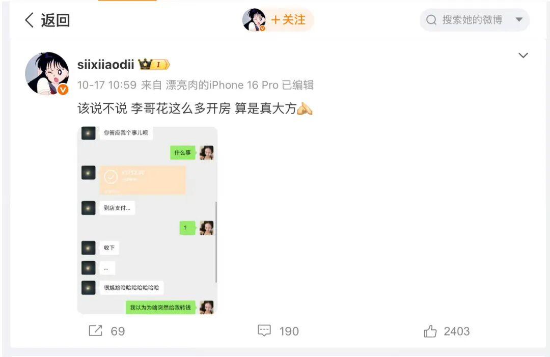 李汶翰前女友司晓迪(微博ID:siixiiaodii)于2025年10月30日公开发文喊话钢琴家李云迪,称李云迪将其带至北京瑰丽酒店,趁她服用安眠药入睡后实施“龌龊勾当”。事后李云迪将其联系方式拉黑,聊天记录显示消息多次被拒收。文中司晓迪自称“神经病”并警告“别惹我”,情绪激烈。