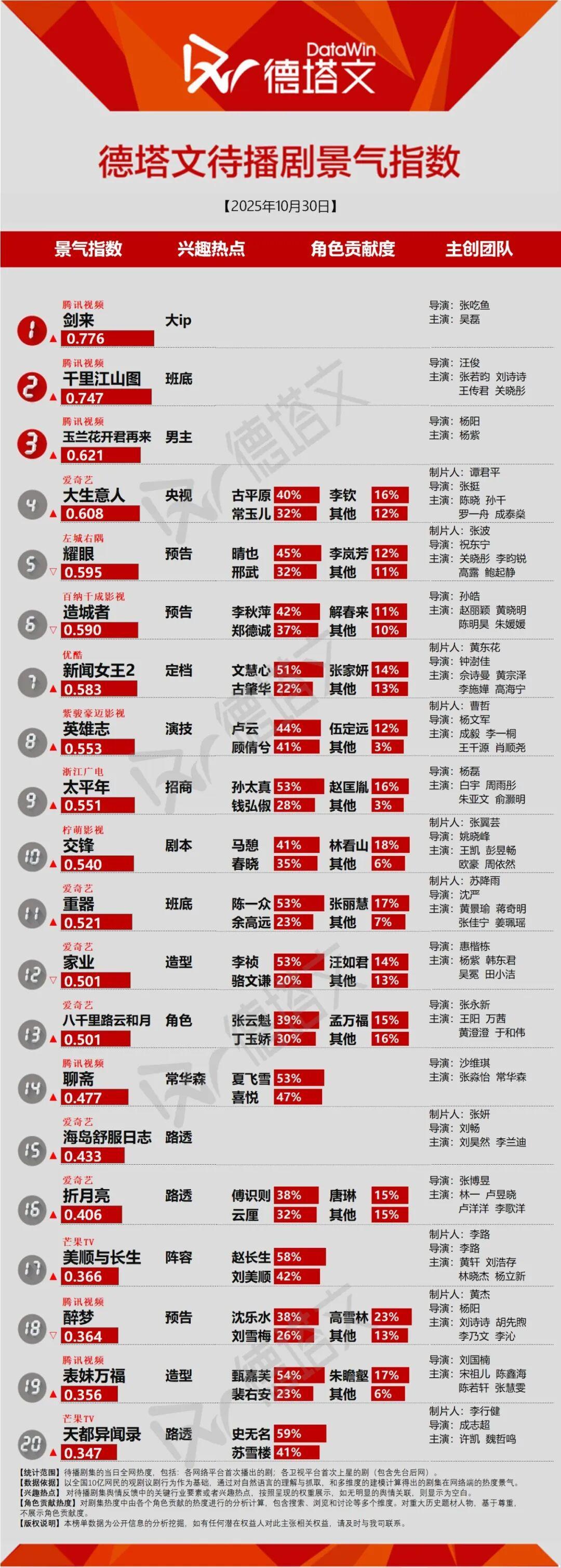 军旅剧《猎豹》于昨日在湖南卫视、芒果TV、腾讯视频等多平台圆满收官。该剧在播出期间,景气峰值达到1.352,均值则为1.151。在古偶与悬疑剧扎堆的Q4档期中,《猎豹》虽热度留存表现稳定,却未能实现破圈效应。