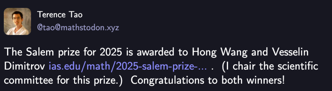 在获奖名单公布后,前塞勒姆奖及菲尔兹奖双料得主陶哲轩第一时间通过社交媒体发文祝贺,引发数学界广泛关注。
